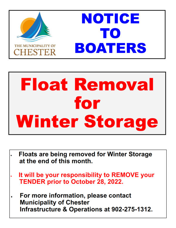 Do you have a tender tied up on a municipal float? We are removing municipal floats for winter storage at the end of October. Please remove your tender prior to October 28. For information, contact the Infrastructure & Operations Department at 902-275-1312.